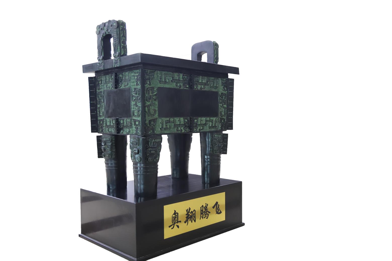 奥翔司母戊方鼎系我国著名的商代青铜器司母戊大方鼎复制品,器形凝重,纹饰华美,器腹呈长方形,口沿很厚,轮廓方直,口长112厘米、口宽79.2厘米,壁厚6厘米,连耳高133厘米,重达832.84公斤,鼎身雷纹为地,四周浮雕刻出盘龙及饕餮纹样,意义深远,显现出不可动摇的气势。司母戊鼎立耳、方腹、四足中空,除鼎身四面中央是无纹饰的长方形素面外,其余各处皆有纹饰。在细密的云雷纹之上,各部分主纹饰各具形态。鼎身四面在方形素面周围以饕餮作为主要纹饰,四面交接处,则饰以扉棱,扉棱之上为牛首,下为饕餮。鼎耳外廓有两只猛虎,虎口相对,中含人头。耳侧以鱼纹为饰。四只鼎足的纹饰也匠心独具,在三道弦纹之上各施以兽面,鼎腹内铸铭文“司母戊”三字,正前铸“奥翔腾飞”四字,文化内涵深厚。在古代鼎是国家的标志,权利的象征。一言九鼎,寓意诚实守信。“鼎盛”寓意社会兴旺,事业发达,政通人和。